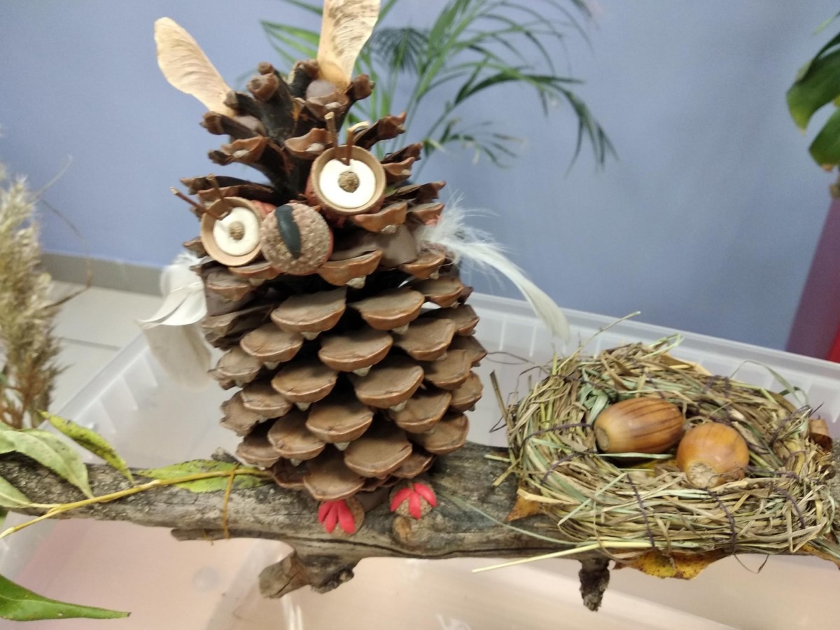 В южных регионах можно использовать каштаны, в северных — крупные шишки сибирской сосны. Главное — объяснить, что эффектную картину можно увидеть в любом материале, покупать дополнительно что-то совершенно не обязательно.