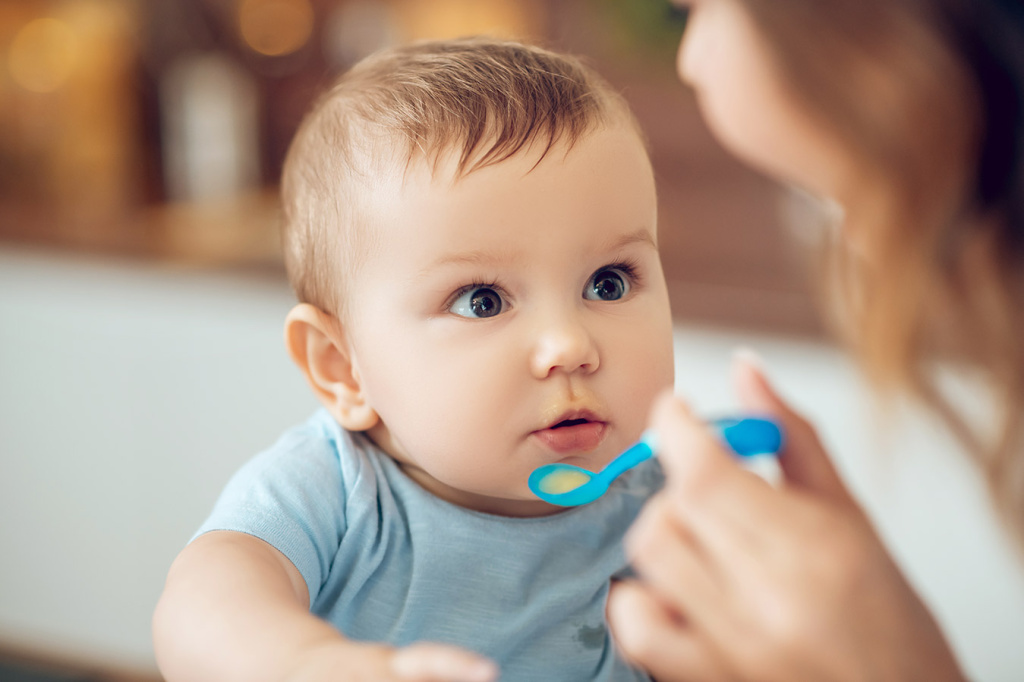 Новорожденные с первого дня жизни получают грудное молоко или правильно подобранную специалистом молочную смесь. Для грудного ребенка первые продукты прикорма рекомендуется вводить в возрасте от 4 до 6 месяцев. Среди них овощные пюре, каши. С 6 месяцев к рациону малыша добавляются мясные пюре, с 7 месяцев в рацион можно вводить яичный желток, с 8 месяцев — детский творожок, кисломолочные продукты и рыбу. В возрасте, когда у ребенка еще не прорезались зубы, пища должна быть мягкой, пюреобразной. Далее вместе с постепенным ростом зубов рекомендуется поэтапно вводить блюда в мелкоизмельченной форме.