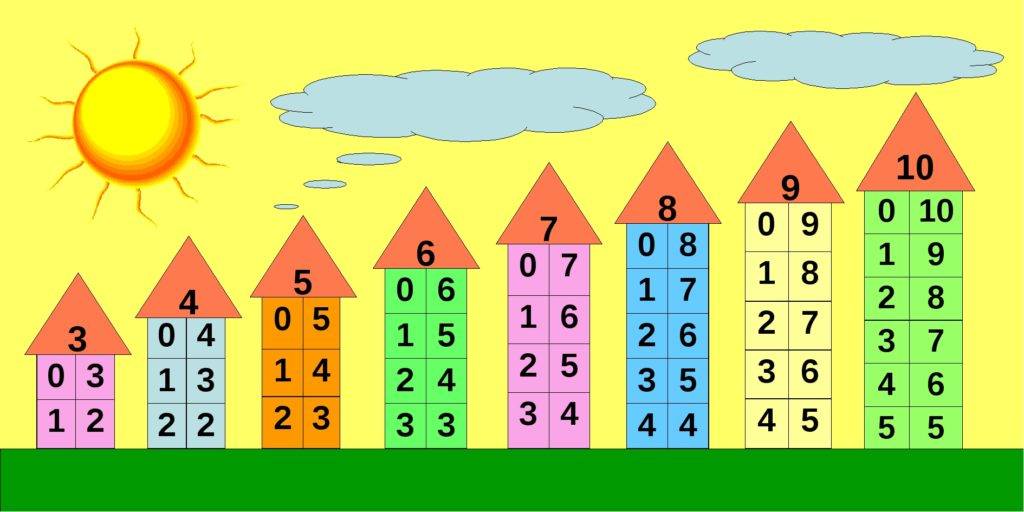 Дом для чисел представляет собой здание, имеющее крышу и несколько этажей с квартирами в два ряда. Высота сооружения зависит от числа, к которому нужно подобрать все возможные комбинации цифр. Чтобы объяснить ребенку состав числа 2, достаточно нарисовать дом с двумя этажами (0+2, 1+1) и так далее.