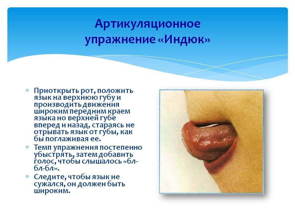 - “Маленькие индюки”. Языком водить по верхней губе вперед-назад таким образом, чтобы получился звук бл-бл. Скорость движений постепенно увеличивается.