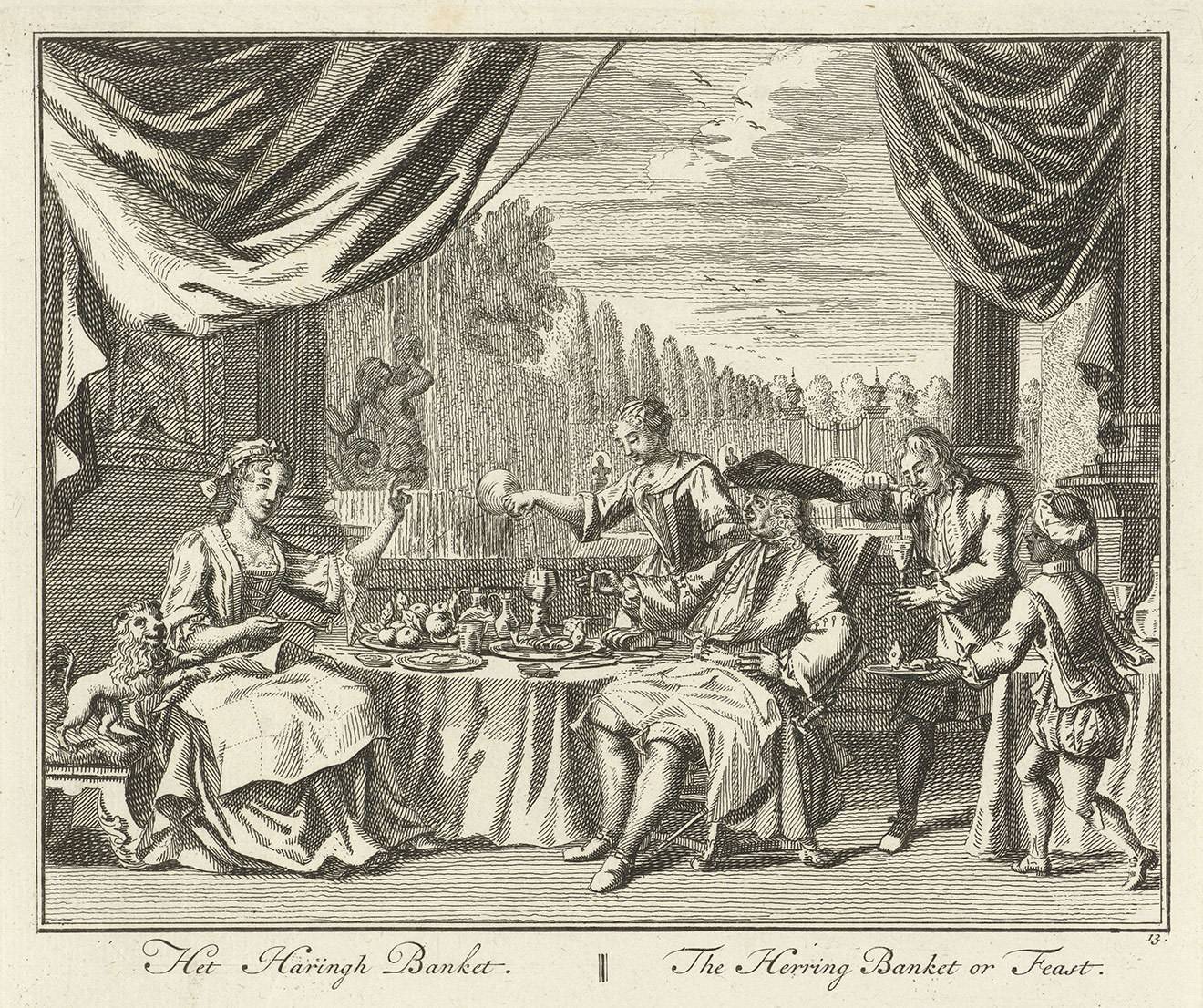 Обед с селедкой. Гравюра Адольфа ван дер Лаана. Нидерланды, 1728–1761 годы