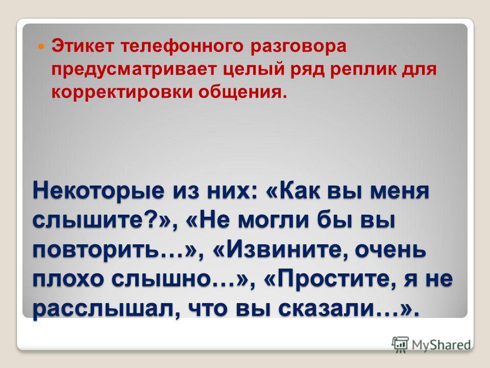 Некоторые из них: «Как вы меня слышите?», «Не могли бы вы повторить…», «Извините, очень плохо слышно…», «Простите, я не расслышал, что вы сказали…». Этикет телефонного разговора предусматривает целый ряд реплик для корректировки общения.