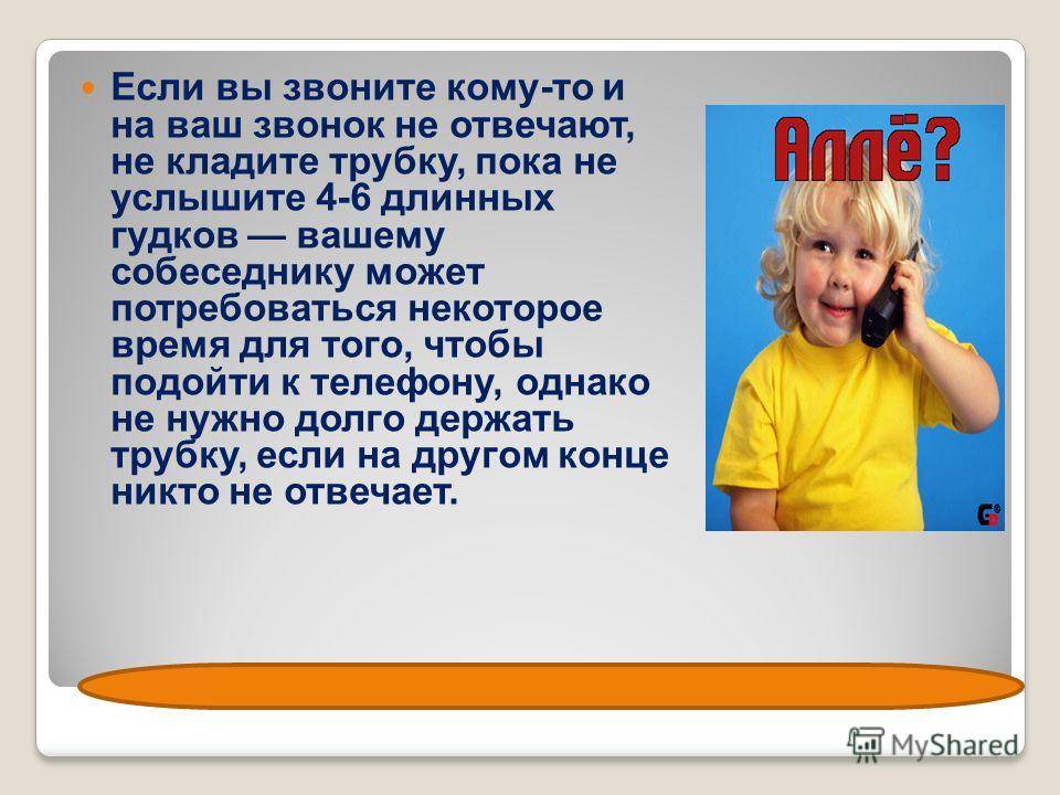 Если вы звоните кому-то и на ваш звонок не отвечают, не кладите трубку, пока не услышите 4-6 длинных гудков вашему собеседнику может потребоваться некоторое время для того, чтобы подойти к телефону, однако не нужно долго держать трубку, если на другом конце никто не отвечает.
