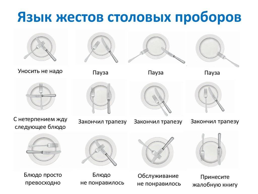 Любое расположение приборов, при котором ручки их смотрят не вниз, а вверх указывает на плохое обслуживание. Правильно пользоваться всеми столовыми инструментами при желании сможет любой посетитель заведения общественного питания. Умение складывать вилки и ложки на столе правильно является признаком хорошего тона.