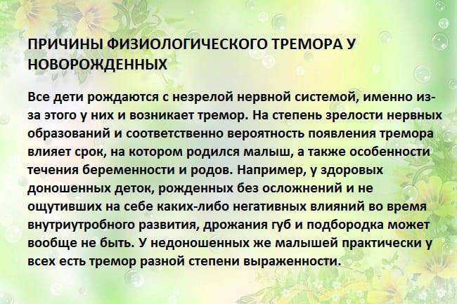 Тремор губ у новорожденных чаще всего вызван преждевременными родами. Это связано также с недоразвитостью нервной системы. Свое формирование нервная система завершает уже вне материнской утробы матери, и даже правильный уход не в состоянии заменить естественные условия. Именно поэтому недоношенные малыши чаще и остальных подвержены тремору.