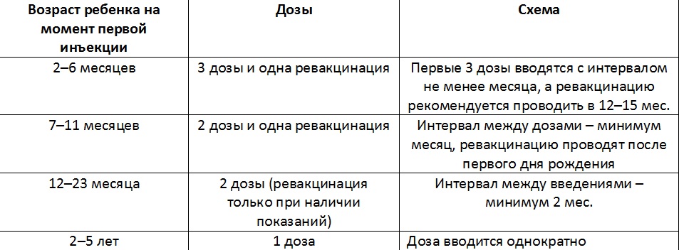 | 2-6 месяцев | 0,5 мл | 3 | 1 месяц и более | 12-15 месяцев | 1 |
