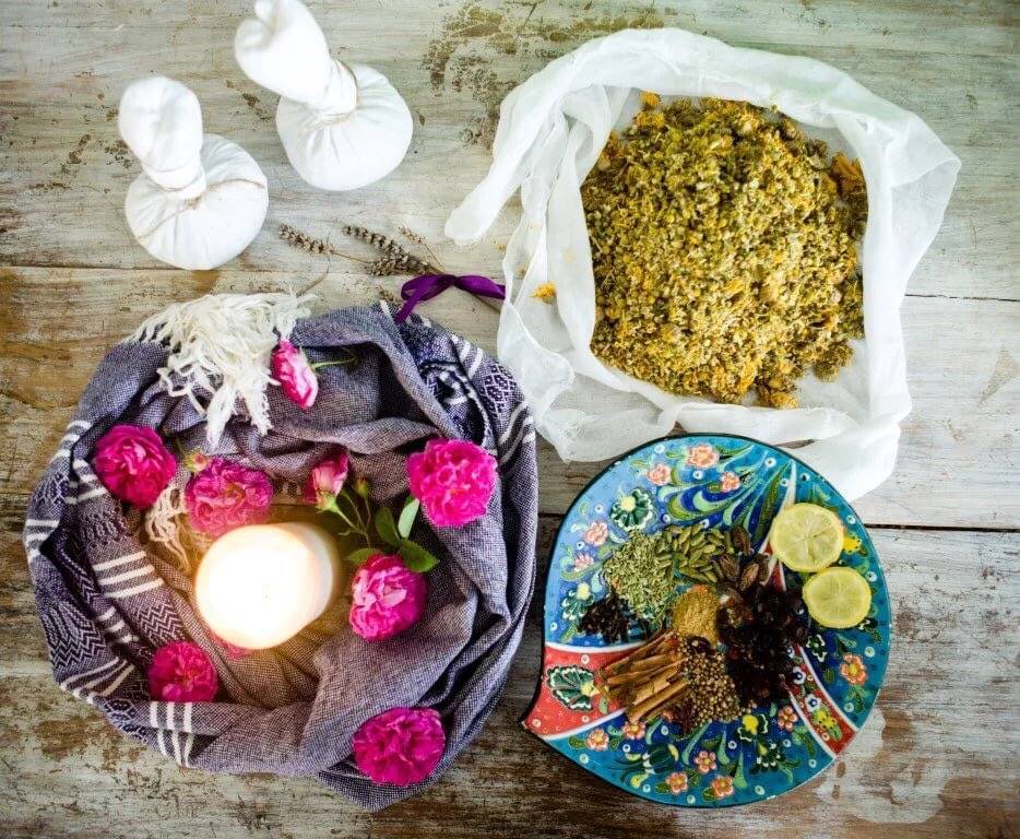 Затем женщина выкладывает свою «мандалу» родов из трав для ванны, эта трава томится в кастрюле.