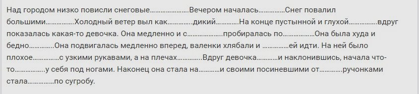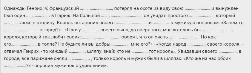 Следует отметить, что людям младше 12-13 лет предлагать это задание нецелесообразно. Предлагают просмотреть текст и вписать в каждый пропуск – только одно слово так, чтобы получился связанный рассказ.