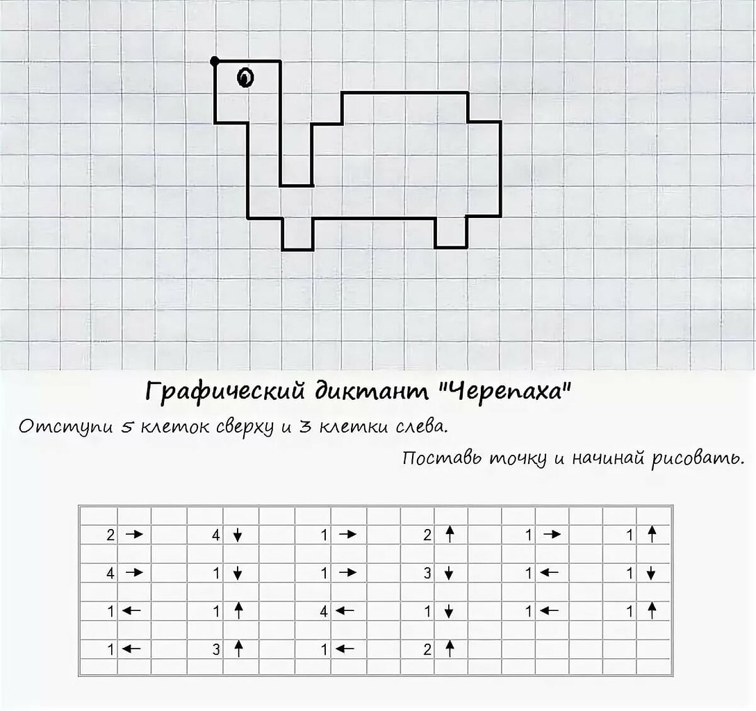 Другое название – рисование по клеткам, графический математический диктант. Задание успешно применяется для развития детей 5-10 лет. Первым его предложил Д. Б. Элькоин. Ранее что-то похожее приводил в «Азбуке» К. Д. Ушинский. Он поместил рисунки для переноса в тетрадь в клетку. Занятие призвано помочь подготовить глазомер ребенка и развить мелкую моторику для обучения в школе.