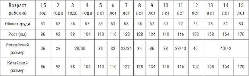 | Размер, Россия | Возраст, лет | Рост, см | Обхват груди, см | Размер, США |