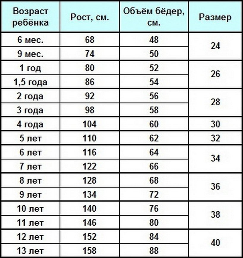 | Возраст | Высота/размер ноги | Длина стопы | Обхват бедер |