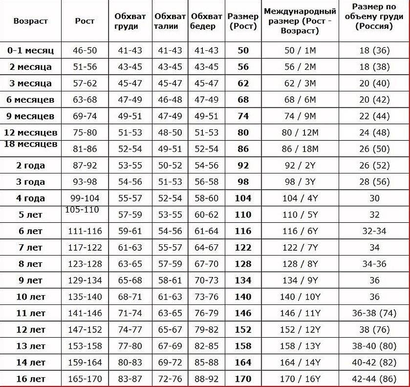| Российский русский размер | Размер, США американский | Возраст, лет | Рост, см | Обхват груди, см |