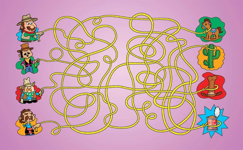 Это довольно простая, но очень интересная игра, требующая высокой концентрации внимания. Цель данного упражнения – найти выход из запутанного лабиринта или проследить, какие объекты соединены между собой линиями. Однако, вести пальцем или ручкой по линии нельзя – отслеживать путь нужно только глазами!
