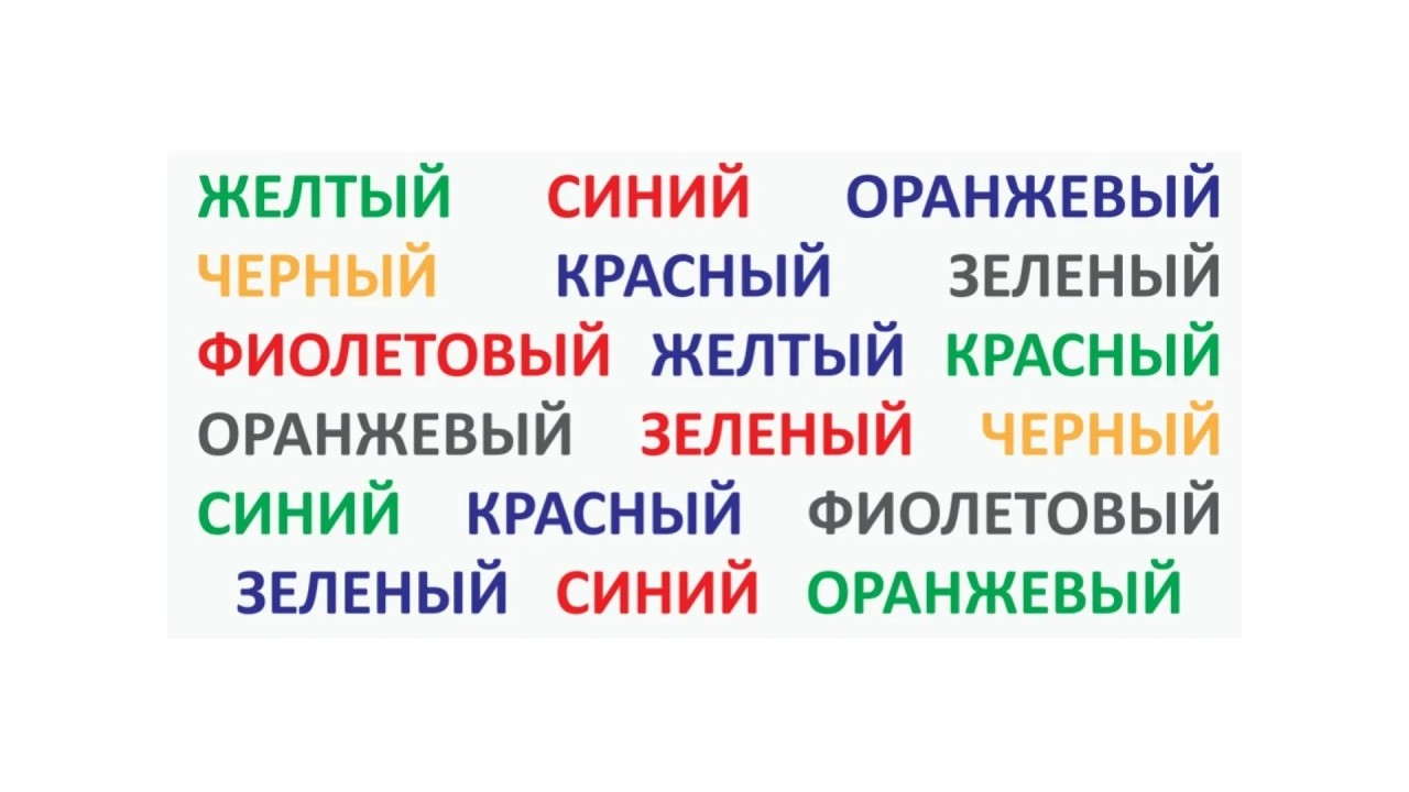 Цель этого упражнения – назвать фактический цвет слова, а не написанный. Например, если слово “жёлтый” написано зелёным цветом, то назвать нужно зелёный и так далее.
