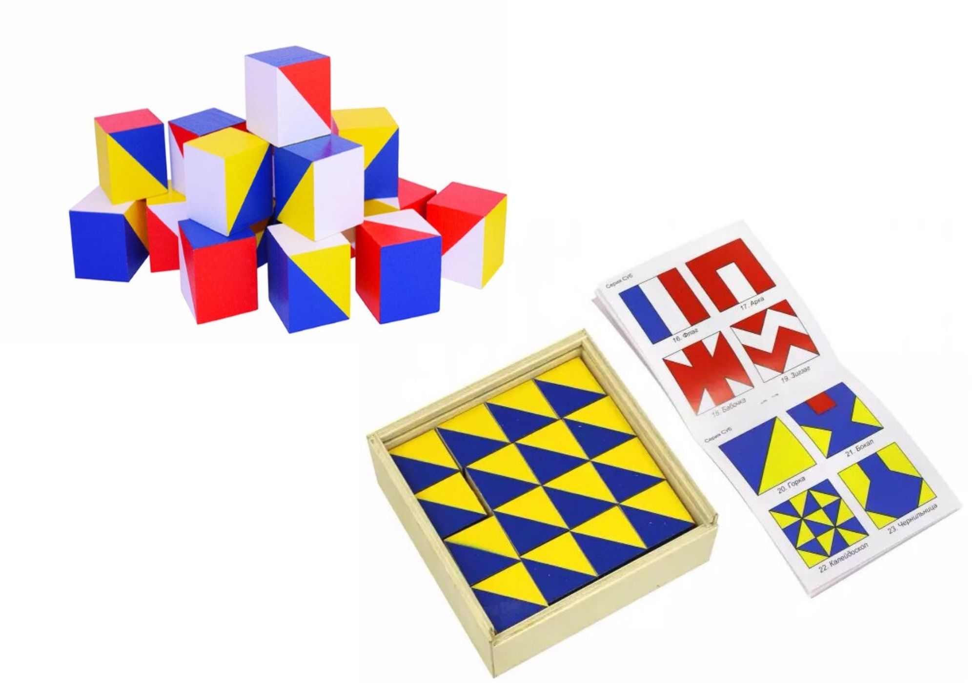 Набор состоит из 16 кубиков одинакового размера. Каждый из них имеет 4 одноцветных грани и 2 двухцветных. Задача ребенка – сложить узор. Например, дорожку из одного цвета. Это самый легкий рисунок, который может выполнить малыш. Можно собирать фигуры по нарисованному образцу, а в старшем возрасте придумывать их самостоятельно. Для игры можно отдельно приобрести специальный альбом с уже нарисованными изображениями. Ребенок должен подбирать подходящие кубики и ставить их на лист.