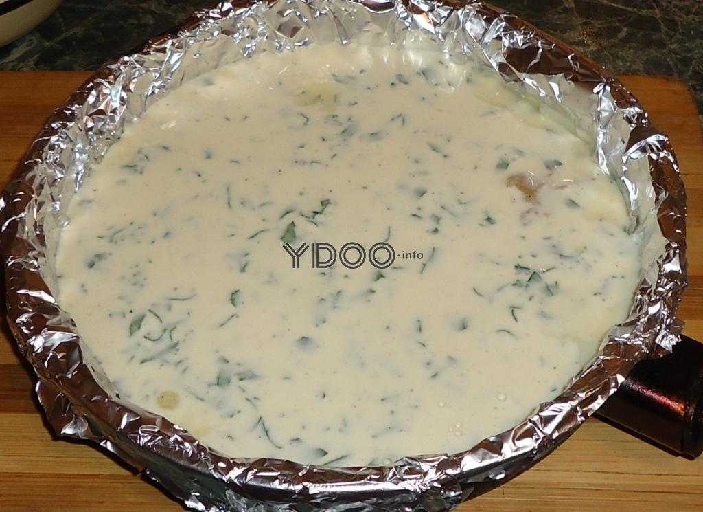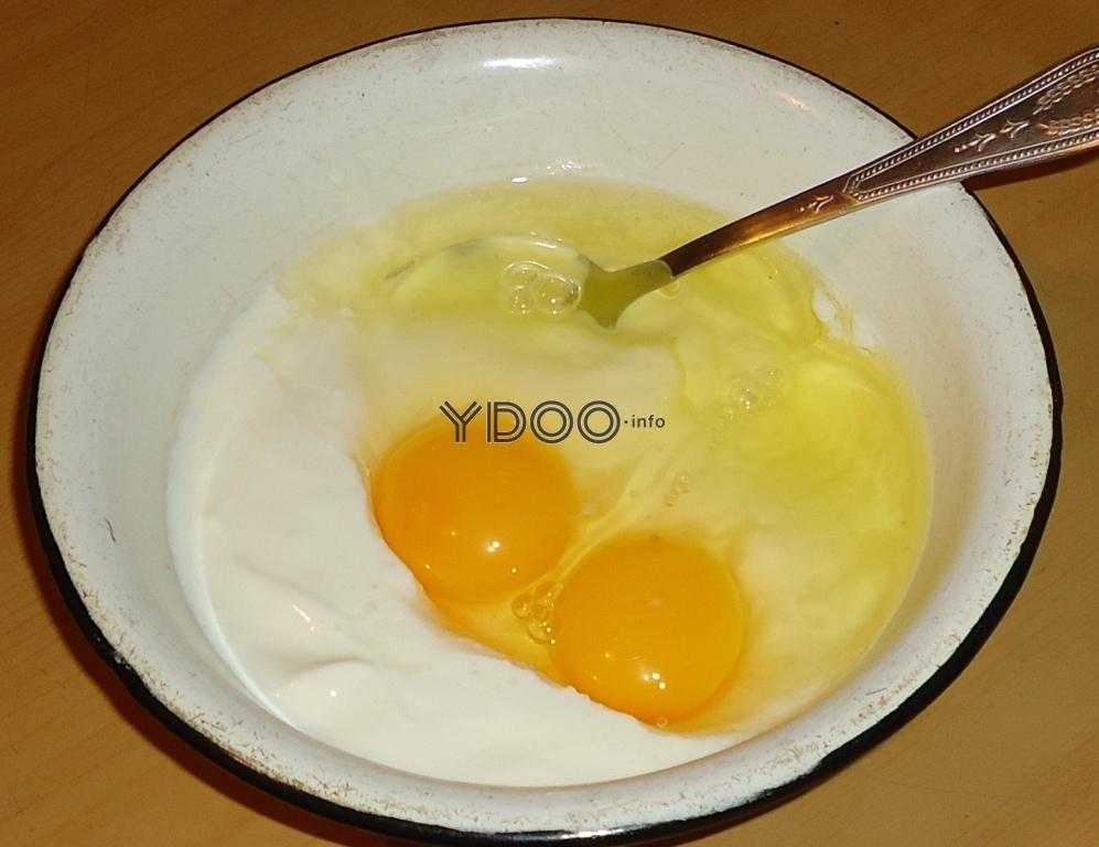 - Взбить два яйца со сметаной и солью и залить будущий киш.