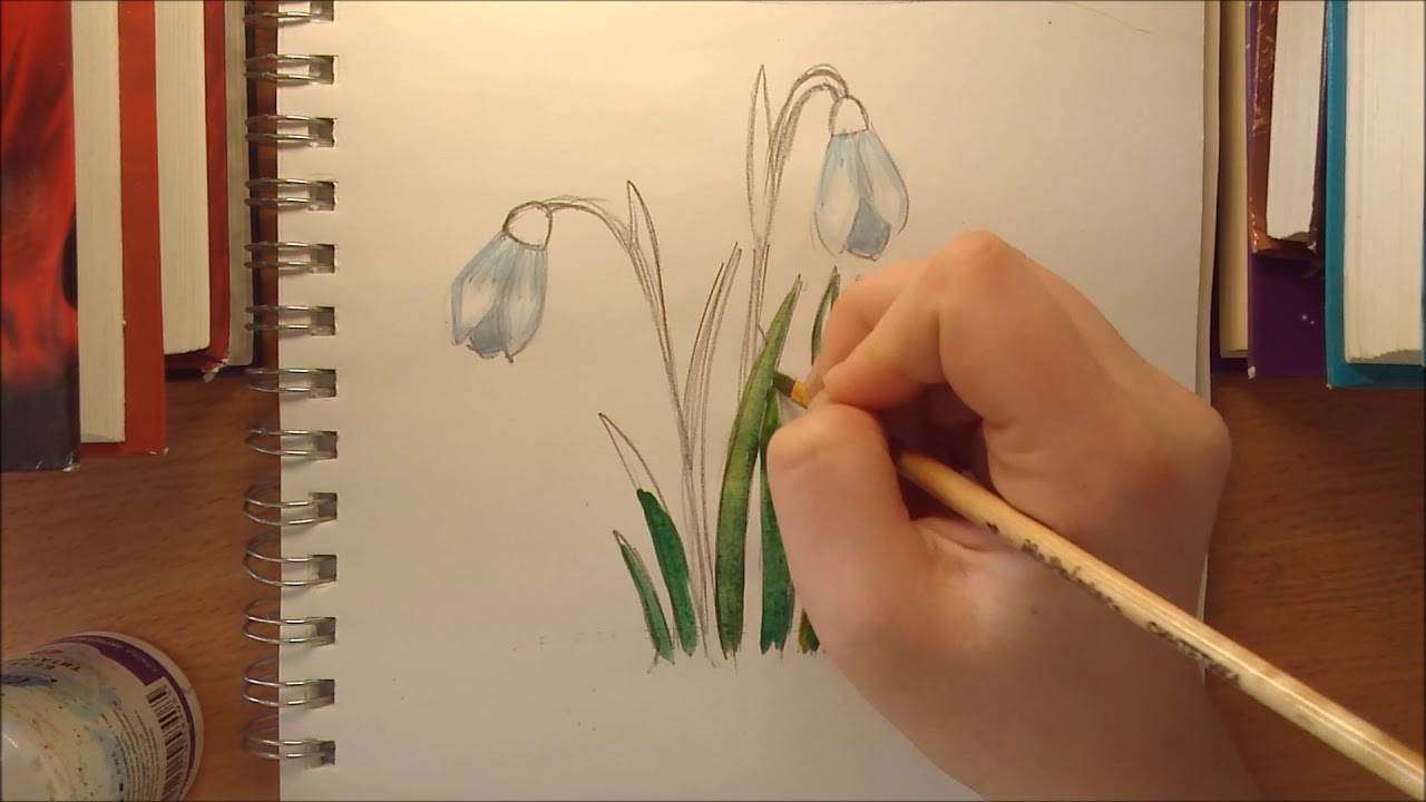 Очень нежным и красивым рисунок подснежника получается, если его выполнить с помощью акварели. Легкие оттенки красок придадут ему реалистичности. Использовать можно, как акварель, так и акриловые краски.