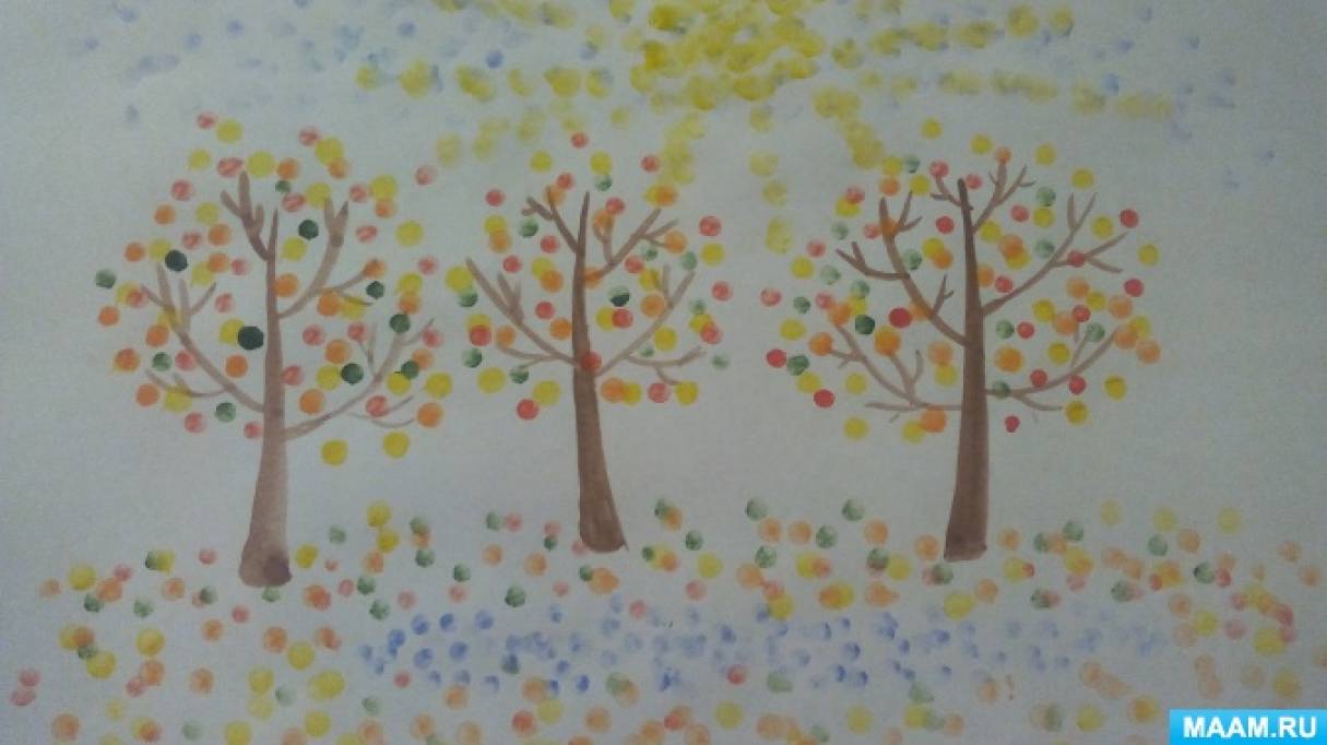 Перед детьми лежат альбомные листы, на которых нарисованы деревья.