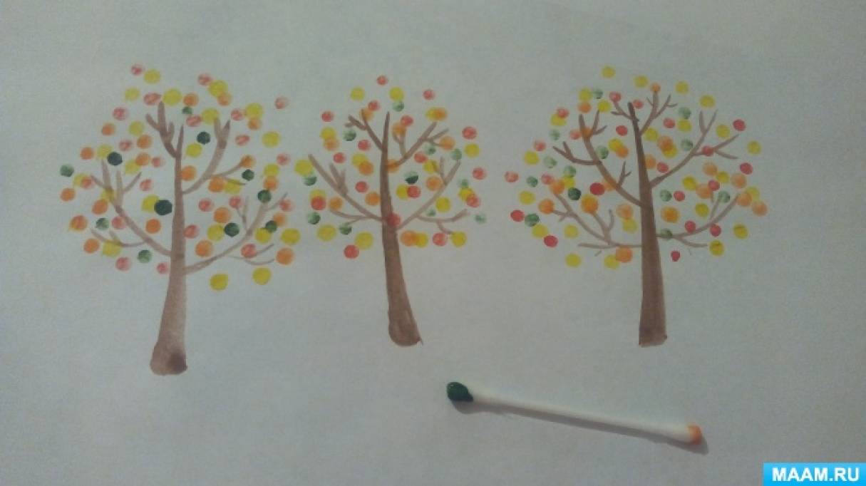 Воспитатель показывает как рисовать листья ватными палочками,объясняет детям, как распределять листья по всему листу. Напомнить, что для того, чтобы сменить цвет, нужно взять чистую ватную палочку и набрать другую краску.