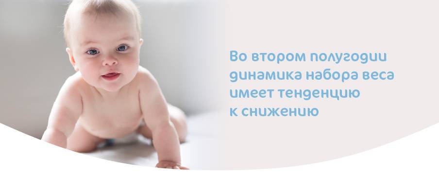Во втором полугодии жизни ребенка динамика набора веса также имеет тенденцию к снижению. Малыш становится все более подвижным, а физическое и психическое развитие требуют много энергии. Кроме того, это время ввода прикорма, так как грудного молока малышу уже недостаточно. И процесс этот медленный и непростой.