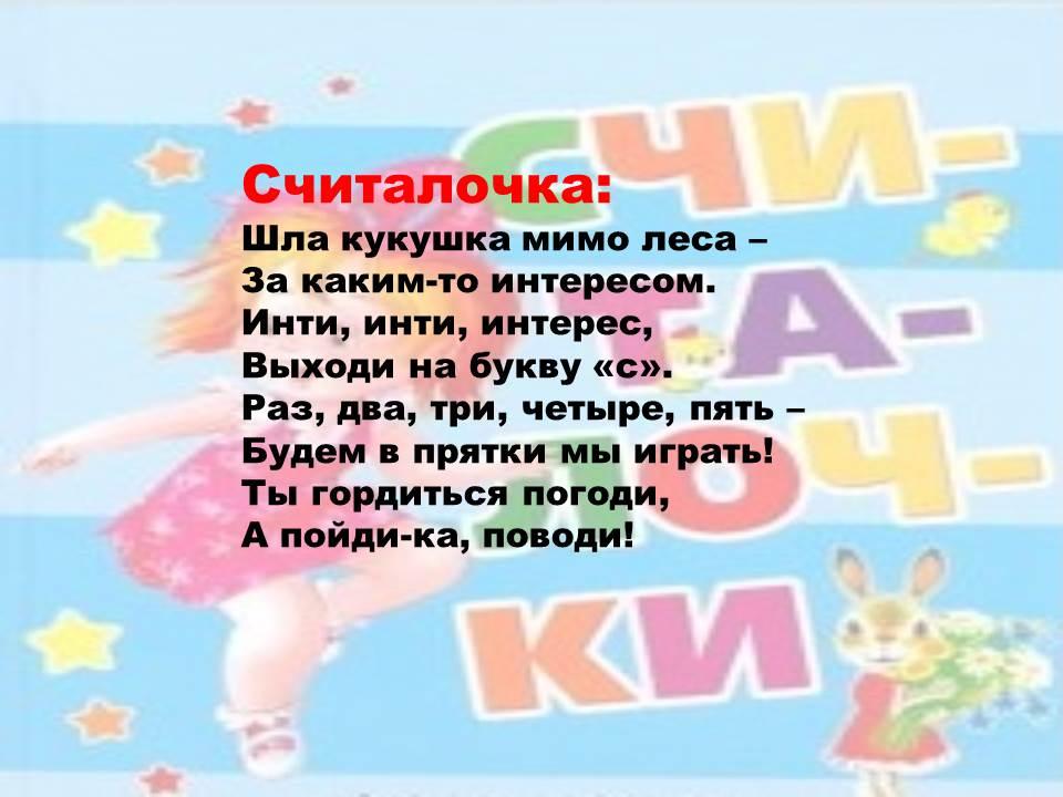 *** Раз, два, три, четыре, Пять, шесть, семь, Восемь, девять, десять. Выплывает Белый месяц! Кто до месяца дойдет, Тот и прятаться пойдет!