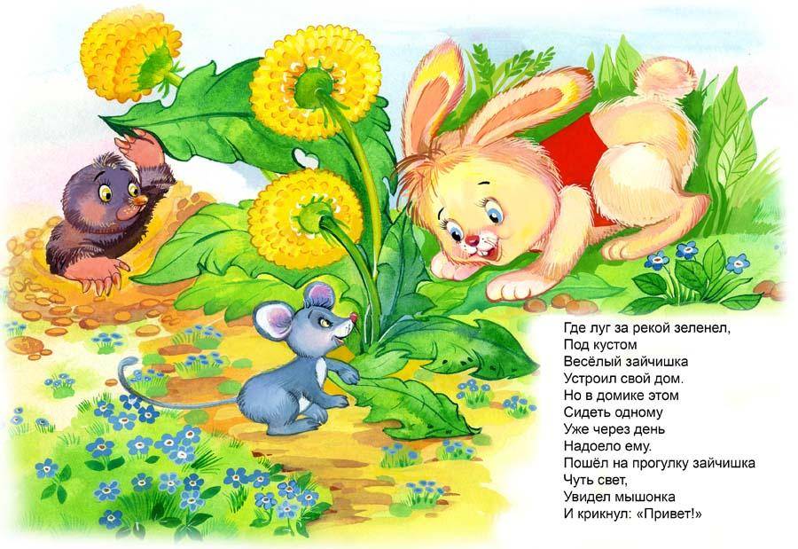 *** Прыг да скок, Прыг да скок, Скачет зайка — Серый бок. По лесочку Прыг-прыг-прыг, По снежочку Тык-тык-тык. Под кусточек присел, Схорониться захотел. Кто его поймает, тот и водит.