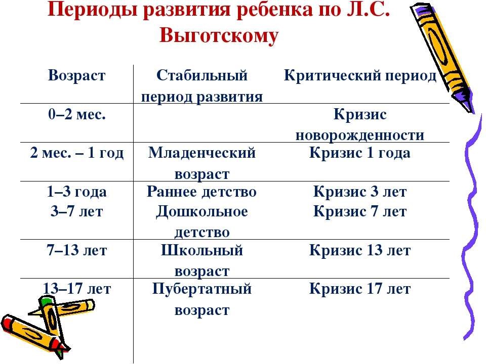 Л.С. Выготским было выделено несколько периодов, отвечающих наличию условий максимальных возможностей для формирования различных психических свойств и восприимчивости к получению различных знаний и навыков: