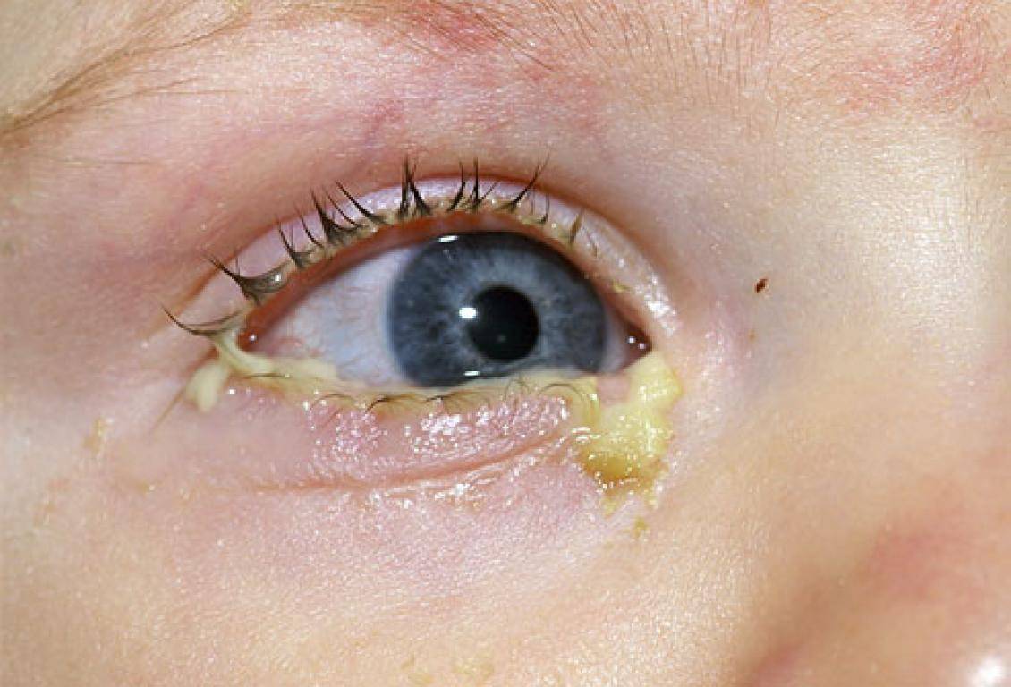 Степень выраженности конъюнктивита при аденовирусной инфекции различна. Его симптомы проявляются на разных стадиях заболевания (как в самом начале, так и на 3-5 день). Поражается сначала один глаз, а вскоре (как правило, спустя 1-2 дня) воспалительный процесс затрагивает и второй. Веки у ребенка отечные, а утром больному бывает сложно открыть глаза, поскольку гнойное отделяемое склеивает ресницы.