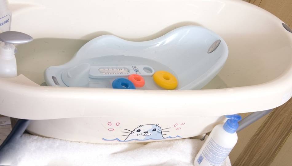 - Емкость с чистой водой необходима для того, чтобы после купания ополоснуть малыша. Температура данной воды — на градус ниже воды, содержащейся в ванночке