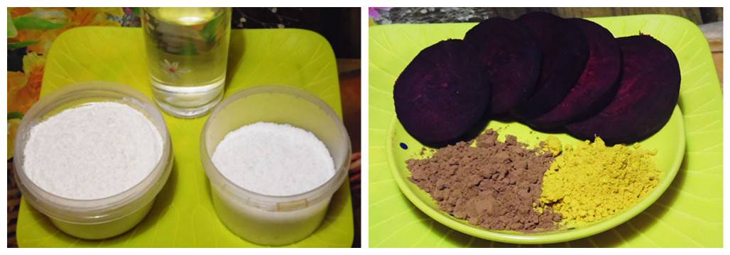 Что касается красителей, то можно применять обычные пищевые, но они могут оставаться на коже рук или натуральные, такие как: