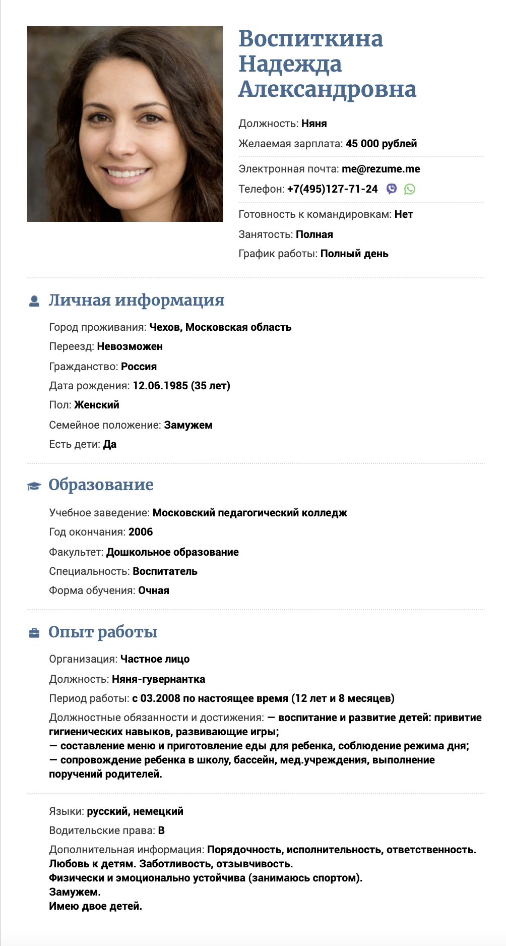 Если соискатель готов рассмотреть разные вакансии, например няня-воспитатель и няня-домработница, то для каждой из них надо приготовить отдельное резюме.