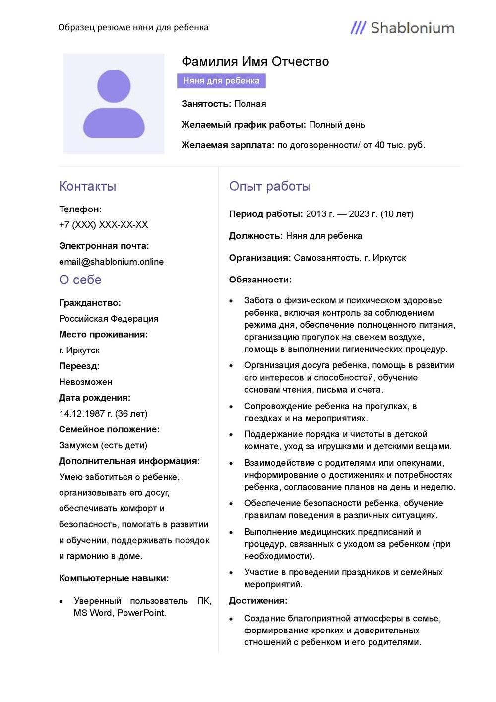 Используйте структурированный образец резюме няни для ребенка для устройства на работу в 2024 году. Заполненный бланк резюме представлен в профессиональном формате, который поможет подчеркнуть ваш опыт, образование, навыки и достижения.