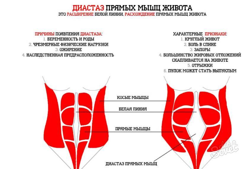 В этом случае стоит провериться на предмет диастаза. Проблема довольно распространенная, возникает именно после родов. Суть нарушения заключается в расширении белой линии живота. Во время беременности ребенок давит на мышцы, и они расходятся на расстояние больше 3 см.