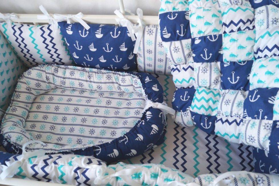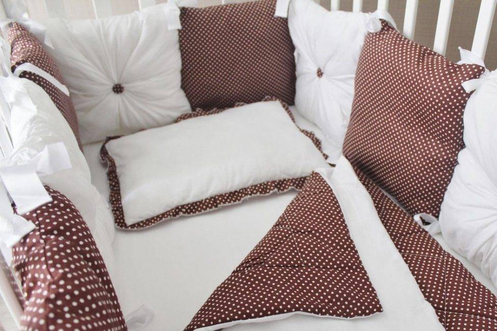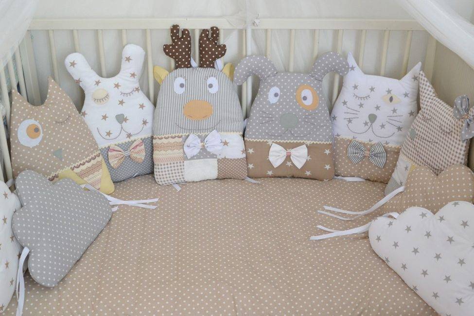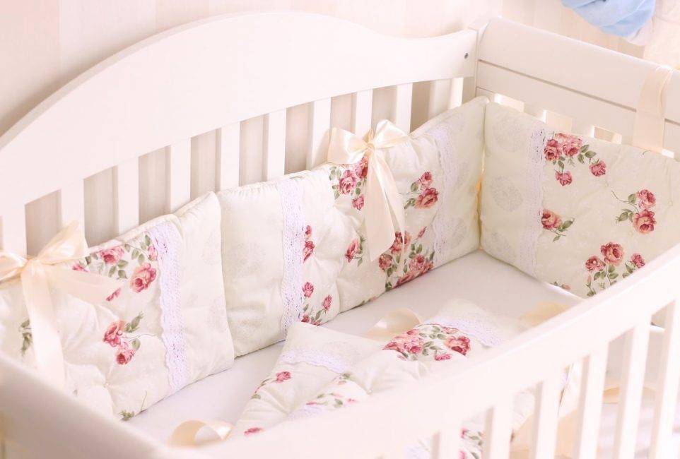 Боковая защита должна быть изготовлена из таких же качественных материалов, как и белье. Это плоские подушечки, прикрепляющиеся ленточками к бортам кроватки по периметру.