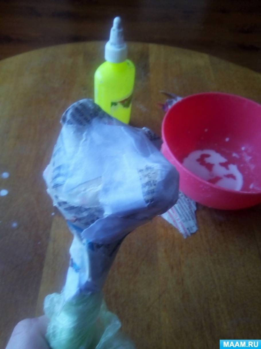 Затем берётся клей и наливается, в какую не будь миску с водой (соотношение пропорции 1:3, где 1- вода, 3- клей). Кусочки смачиваются в воде с клеем и наклеиваются на заготовку. Обмакиваем кусочки бумаги и наклеиваем слегка в перехлёст слоёв в десять приглаживая пальцем. Когда наклеите слоёв 5, надо дать высохнуть и наклеить ещё 2-3 слоя и даем высохнуть.