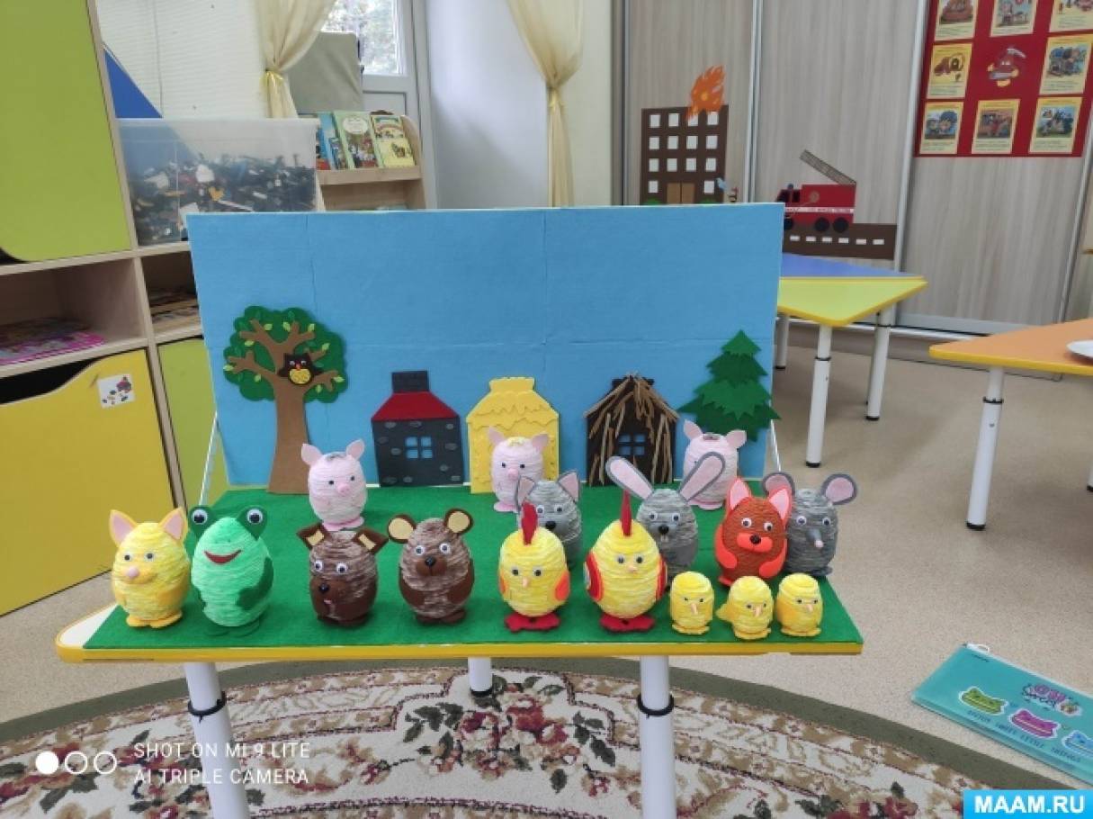 Интересные варианты получаются из баночек от йогурта и пластиковых бутылок. Их обклеивают цветной бумагой, крепят изображения персонажей и добавляют фрагменты декораций. Получаются объемные мини сюжеты. Такие фигуры не требуют дополнительных декораций и развивают воображение детей.