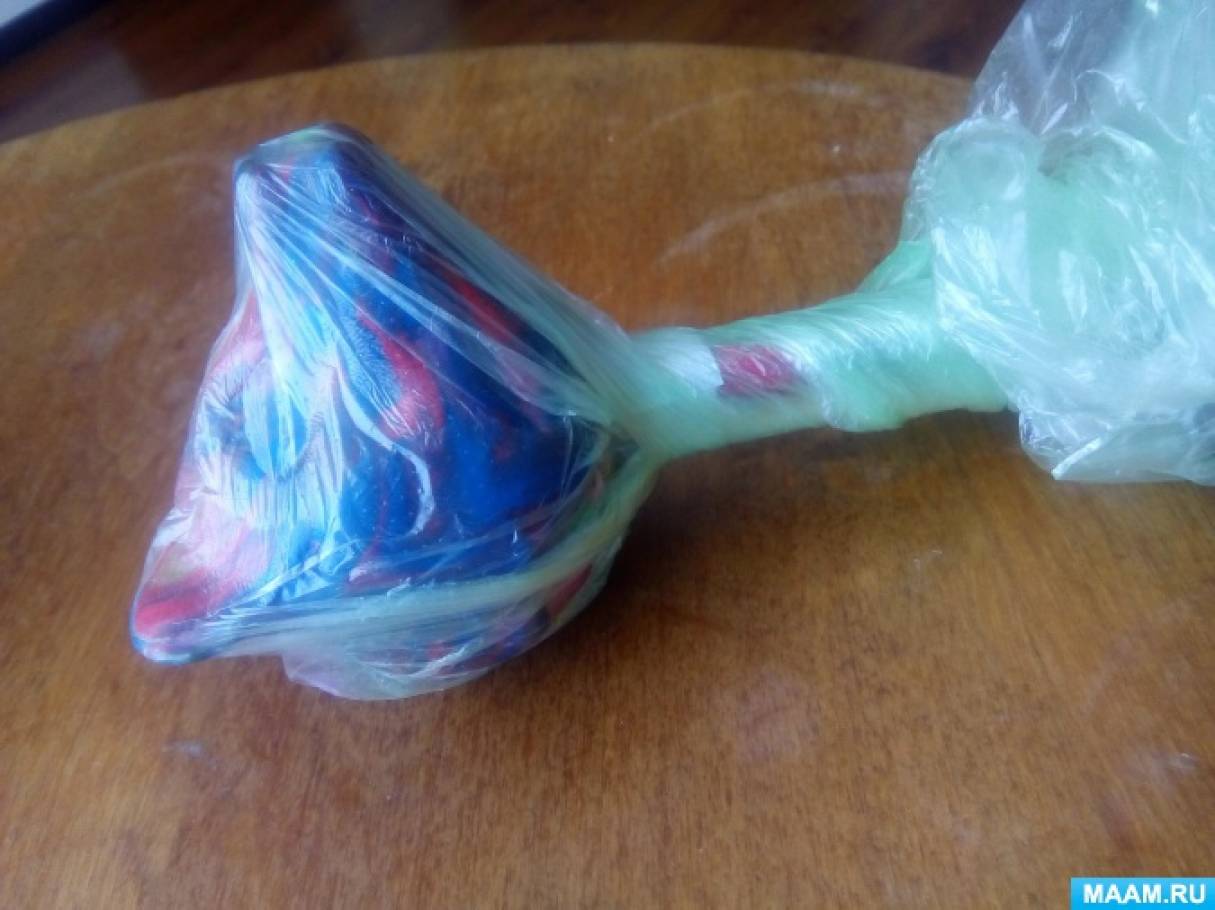 Затем заготовку обматываем упаковочным пакетом, чтобы бумага не прилипала к пластилину.