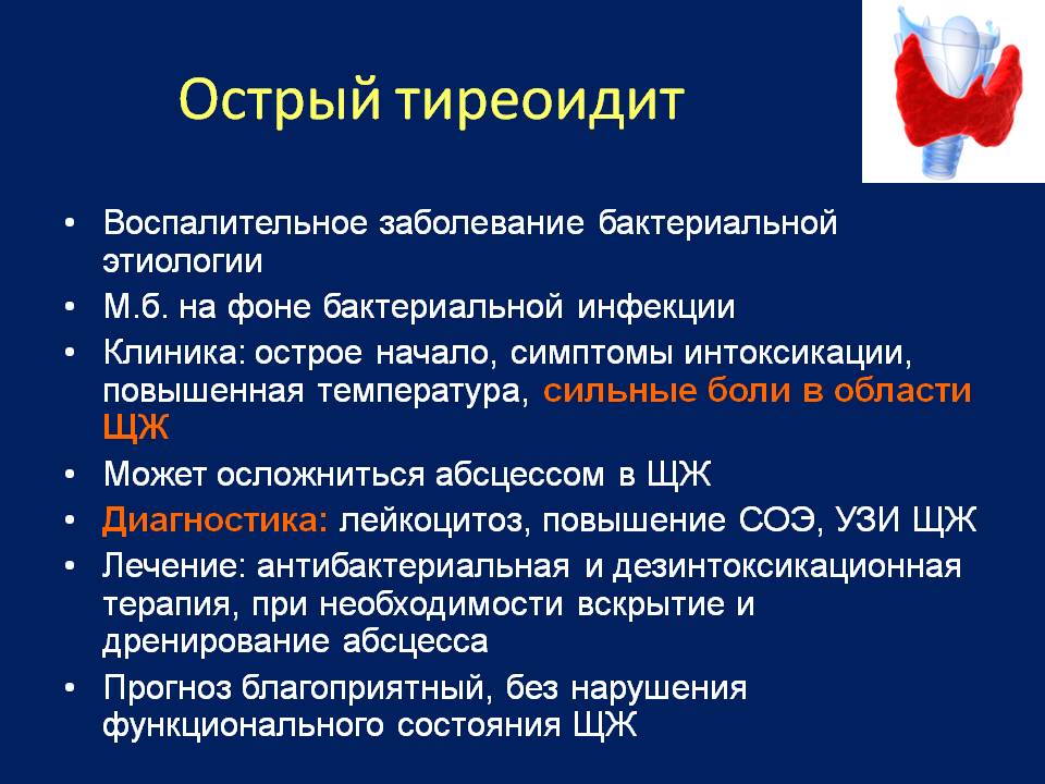 Является довольно редким заболеванием. Для патологии характерно очаговое или диффузное воспаление щитовидной железы. У больных с острым тиреоидитом болевой сидром локализован в шее спереди, с левой и/или правой стороны. Клиническая картина зависит от активности и характера воспалительного процесса (гнойный, негнойный), локализации патологии.