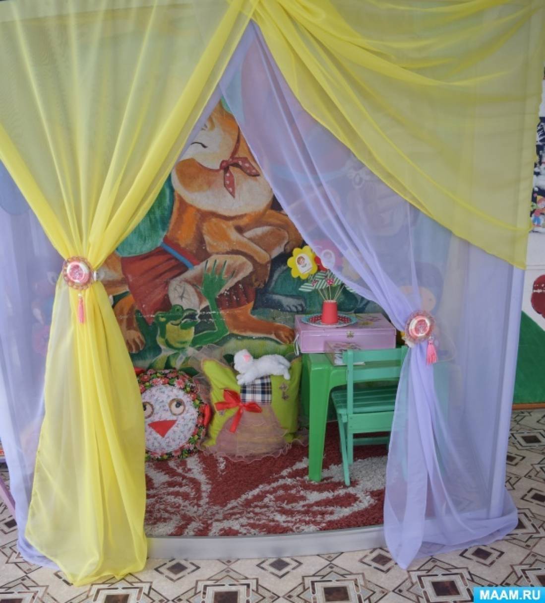 - места для уединения (палатки или шатра, раскинутого над стулом), где малыши могут посекретничать, помечтать, посмотреть картинки, фотографии,