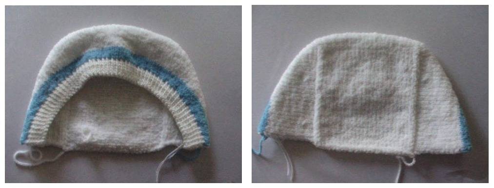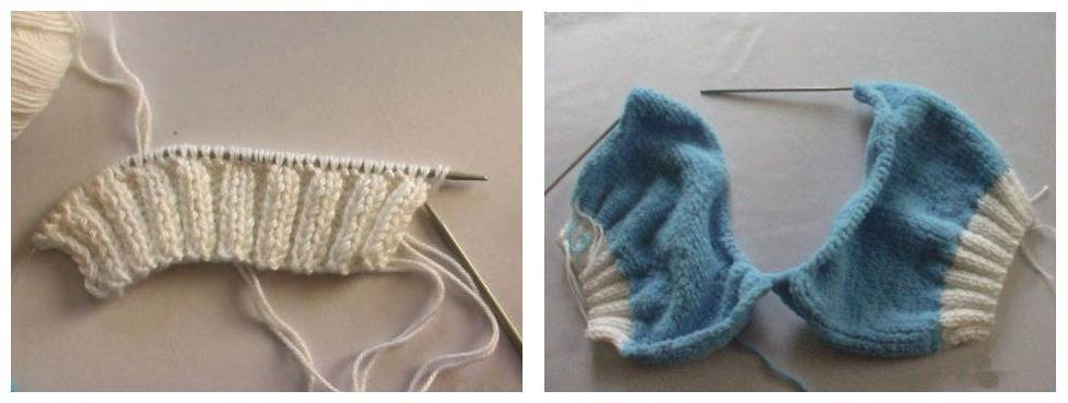 Для капюшона набрать 88 петель. Вязать их полой резинкой 12 рядов. В конце работы в нее нужно будет вставить завязку. Теперь вводится голубая пряжа. Ею поднять работу на 4 ряда, при этом убавить 8 петель. Ввести белую пряжу, и вязать 22 ряда.