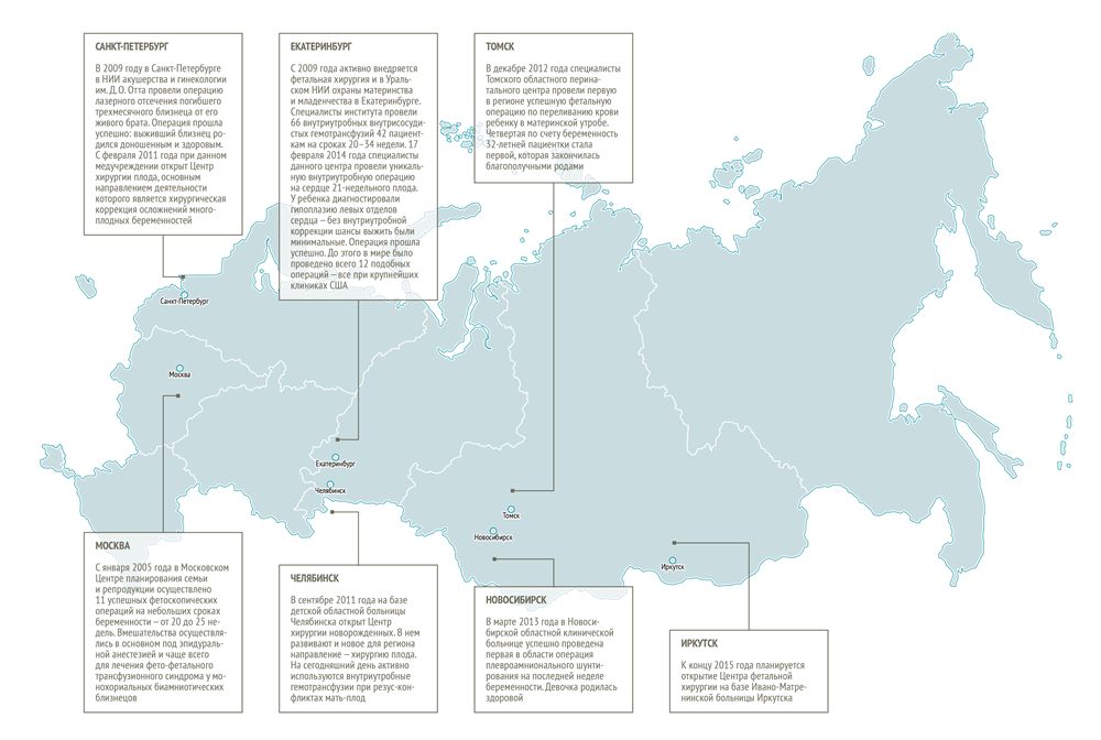 Сегодня фетоскопические операции проводятся в ряде клиник Российской Федерации.К сожалению, несмотря на прогресс последних лет, российские успехи в фетальной хирургии на фоне развитых европейских стран и США пока выглядят скромно. Давно назрела необходимость в координации действий всех подразделений здравоохранения, которые занимаются исследованиями плода.