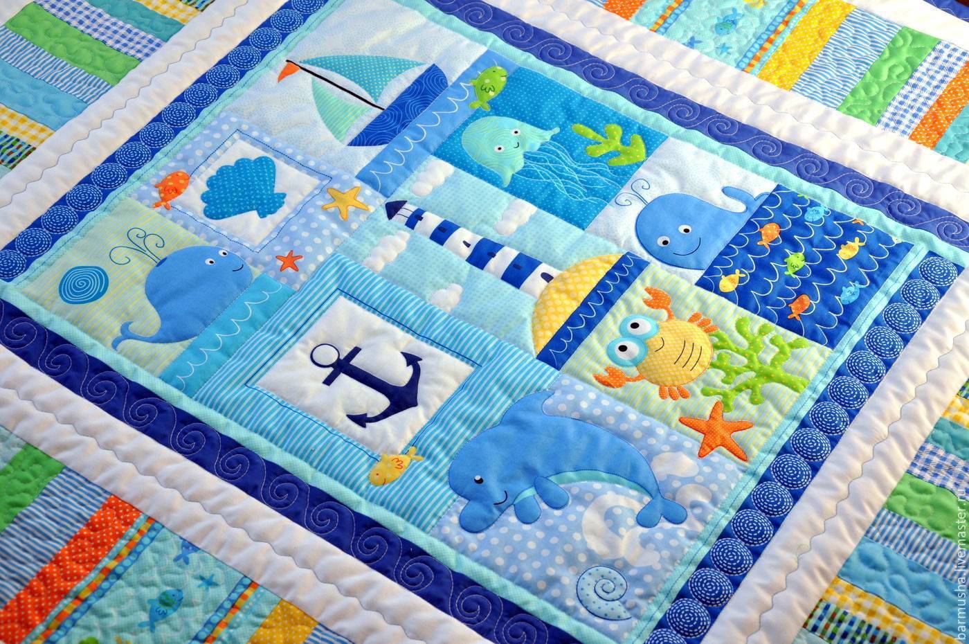 - Одеяло. Оно будет теплым и хорошо выглядеть. Кроме того, можно вшить лоскутки с разной текстурой, чтобы ребенок развивал мелкую моторику.