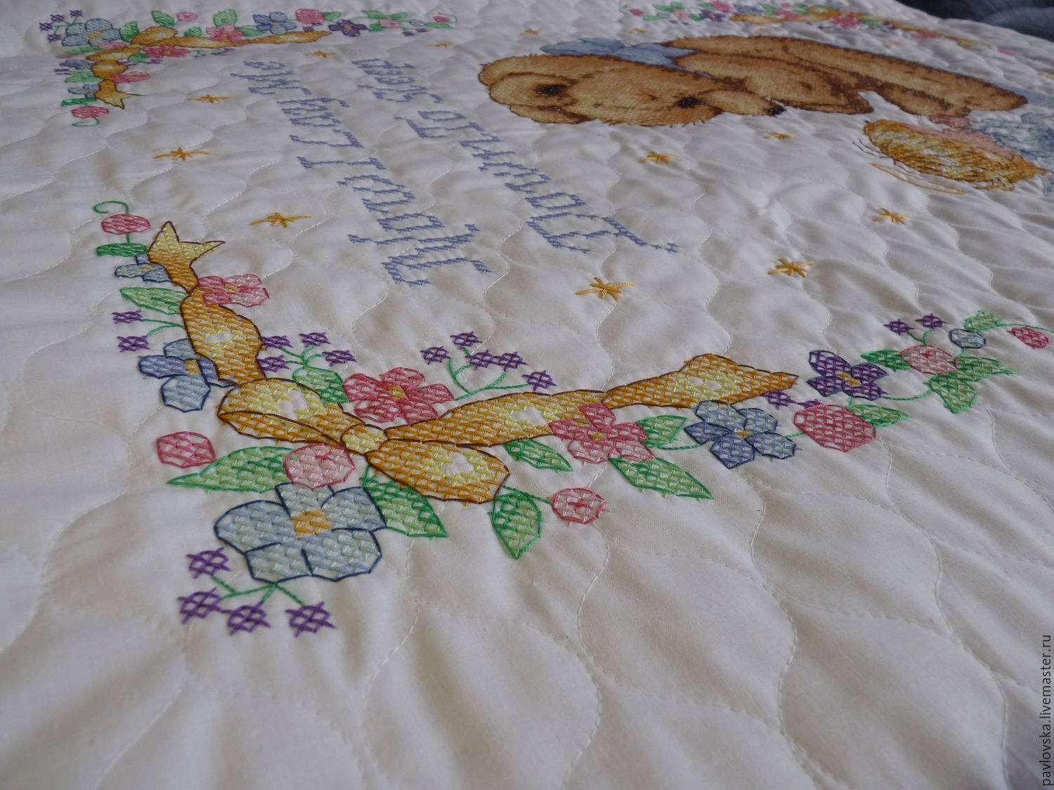 Если вышивать вы не умеете, то можно ограничиться аппликацией. Ее либо пришивают, либо клеят. В первом случае она прочнее и лучше выглядит, во втором — хуже держится, но требует всего 5 минут на прикрепление. Изображение нужно делать без страз и на внешней стороне одеяльца.