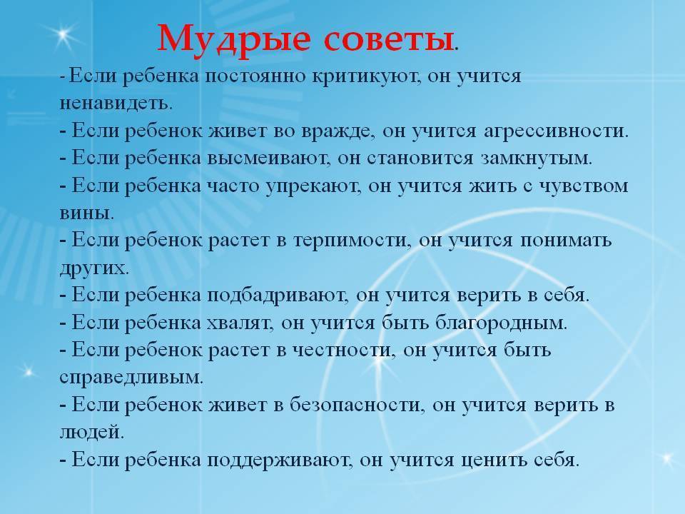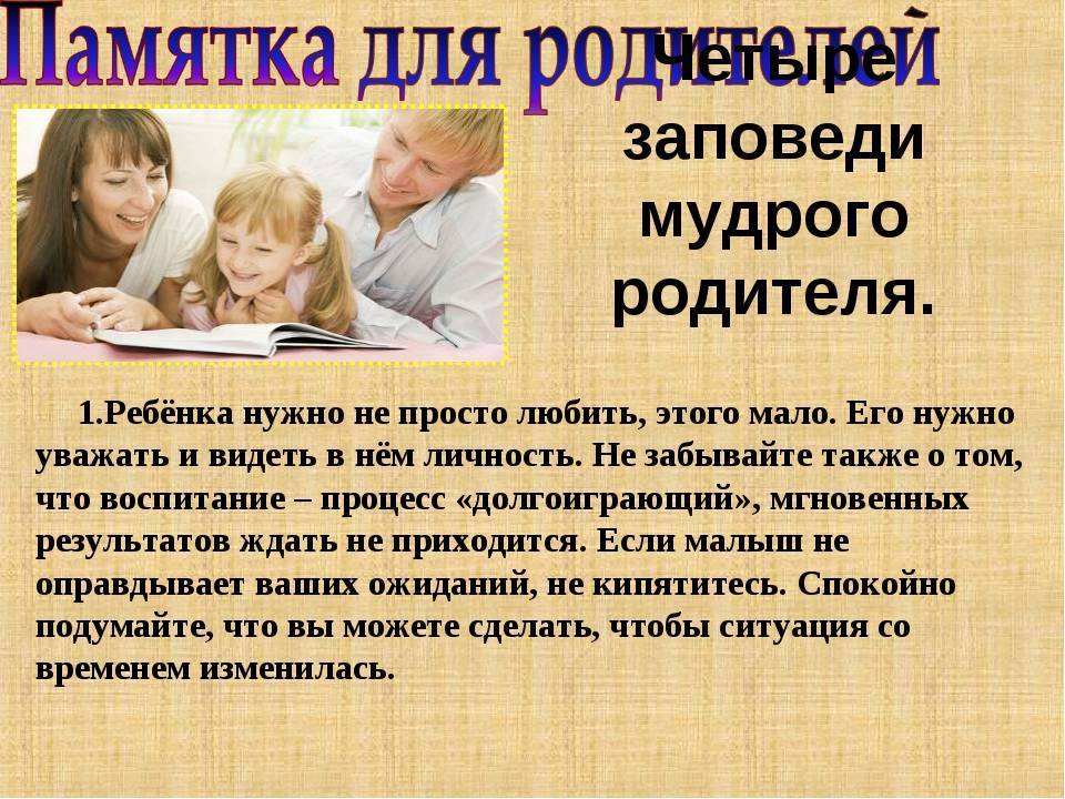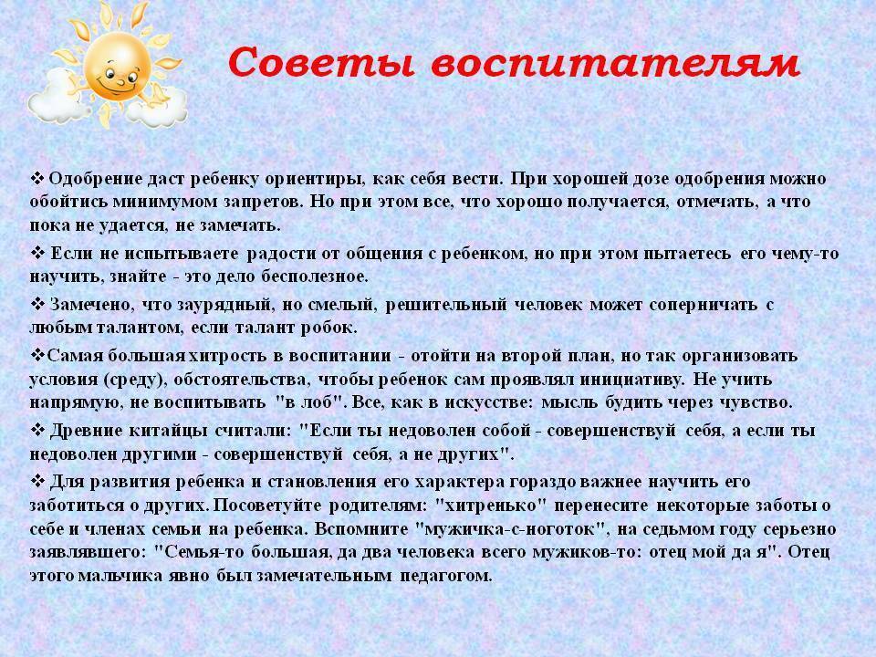 Воспитание ребенка это не решение уравнения по заготовленному алгоритму. Это творчество. Здесь нет общих рамок, есть лишь примерные ориентиры. И есть базовый принцип – индивидуальный подход, то есть учет особенностей ребенка и специфики того мира, в котором он живет.