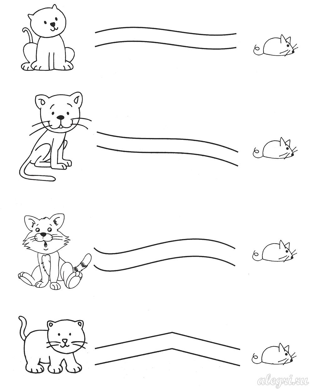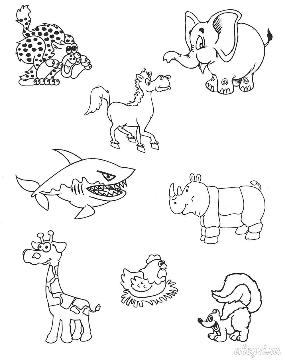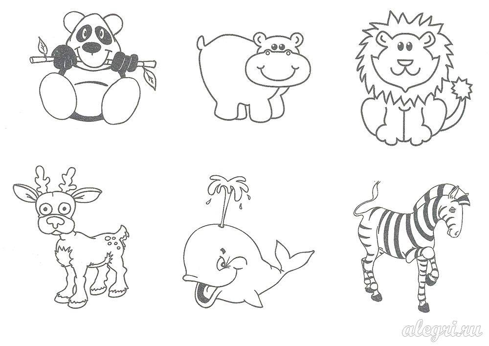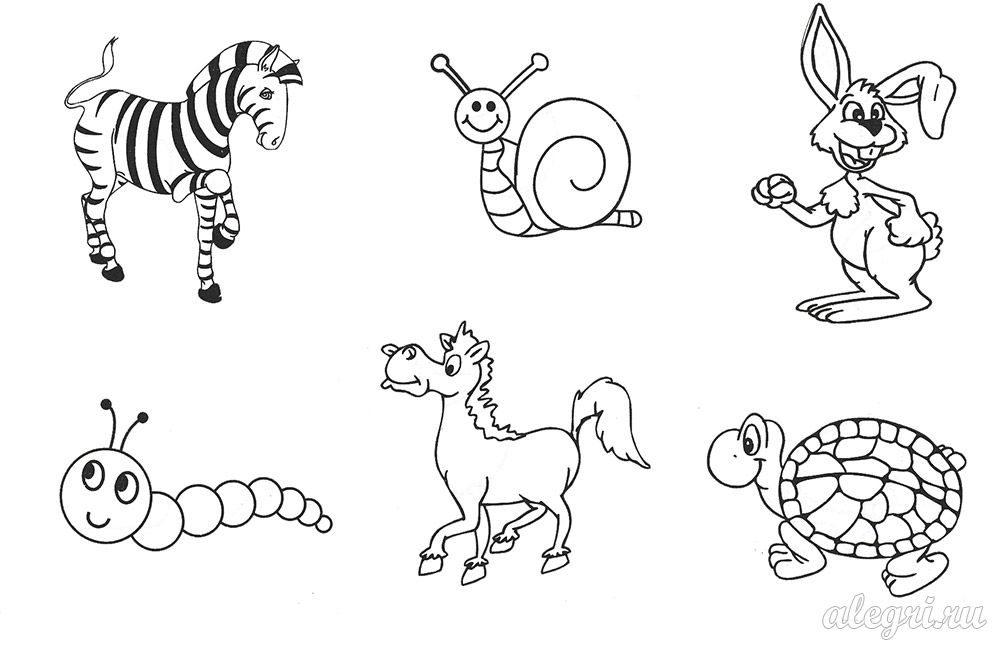Обведи чёрно-белых зверюшек и раскрась остальных.