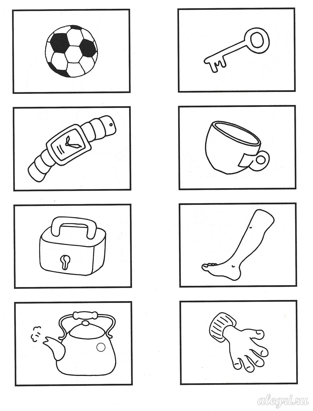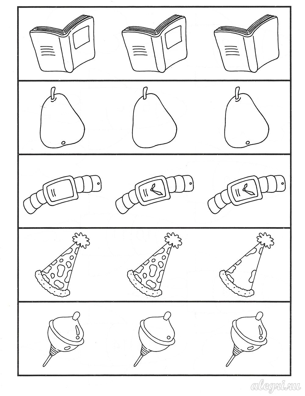 В каждом ряду найди два одинаковых предмета.