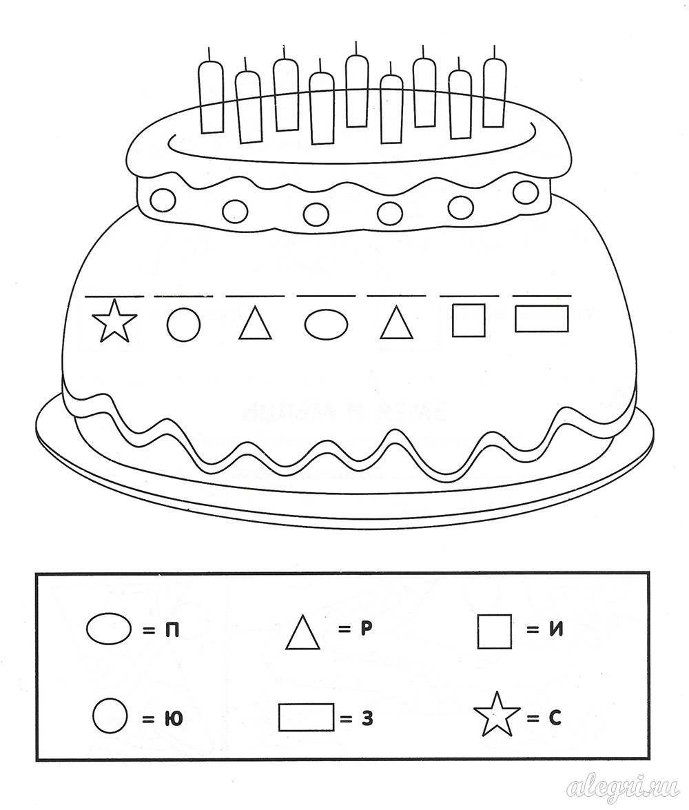 Сделай надпись на торте, пользуясь подсказкой в рамке, и ты узнаешь, как называется неожиданный подарок. Раскрась картинку