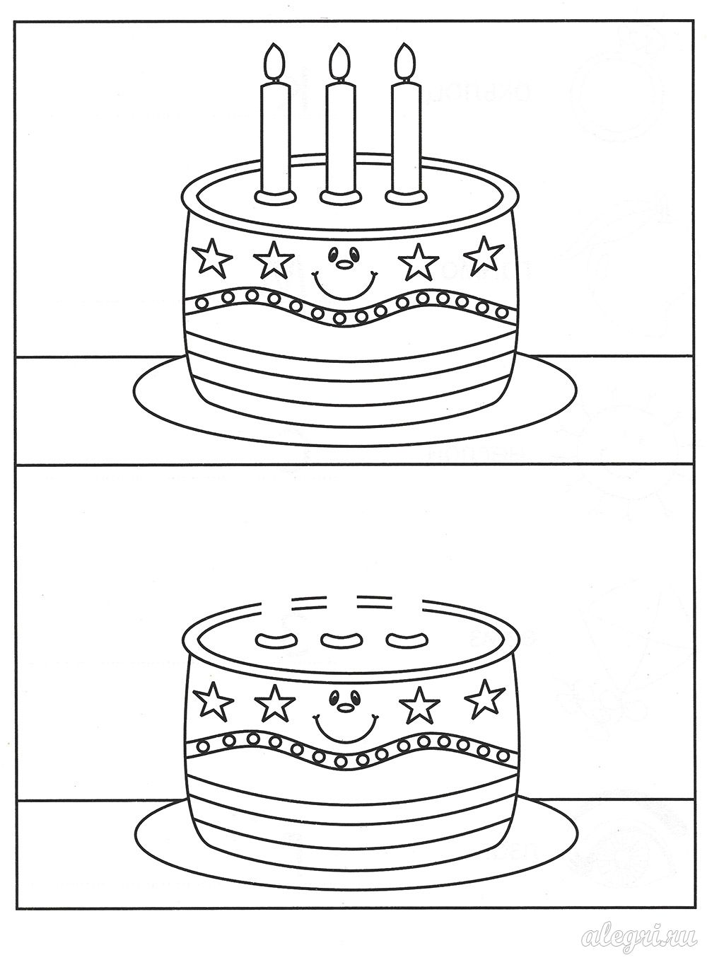 Внимательно посмотри на верхнюю картинку и скажи, чего не хватает на нижней. Дорисуй нижнюю картинку. Раскрась картинки.